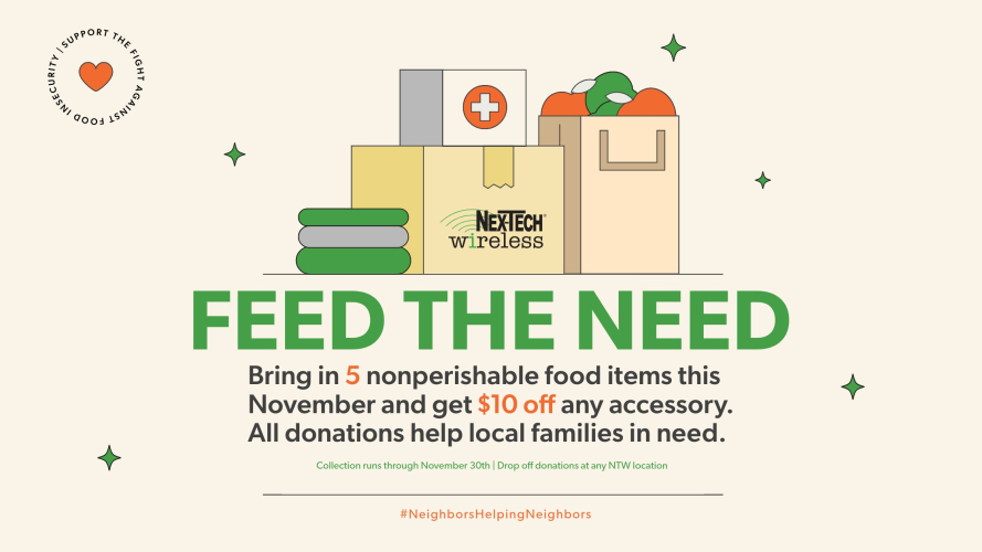 The holidays are a perfect reminder that we’re all connected, and when we come together for a common cause, amazing things happen. Throughout the month of November, we’re hosting a food drive to support local food banks and families right here in Kansas. Bring in 5 nonperishable food items to any Nex-Tech Wireless location and get $10 off any accessory. All donations help local families in need.